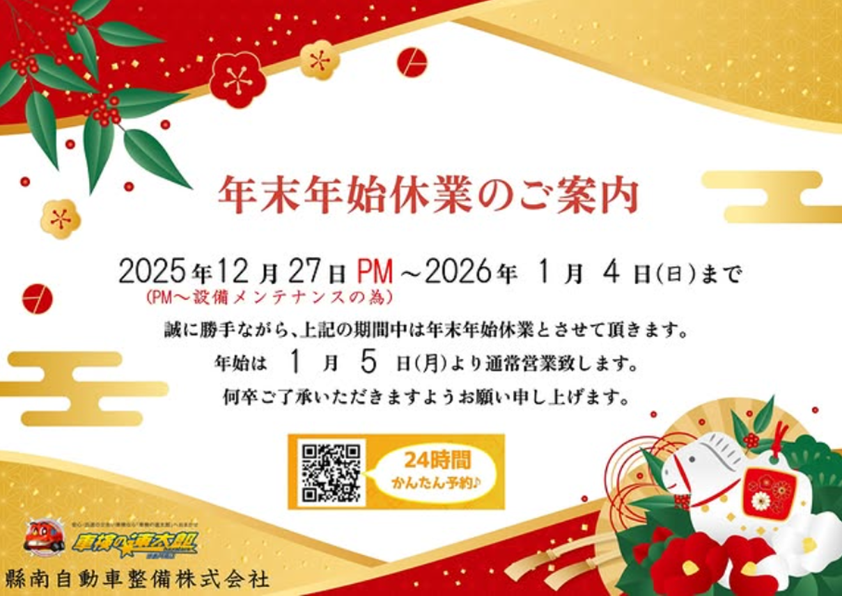 年末年始休業のお知らせ 2025年12月3日 最終更新日時 : 2025年12月3日 kennanjidousha \\ フォロー・シェアお願いします // 12/27(土)は設備メンテナンスの為、午前中のみ営業になっております。ご了承ください。 年末年始は車検の予約がたくさん入り、都合の良い日・時間が取りにくくなることが予想されます。車検は、2カ月前に受けても車検日は変わりませんので、お早めに受けることをお勧めします。
